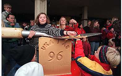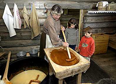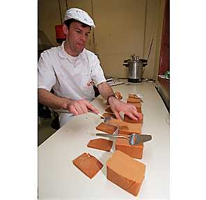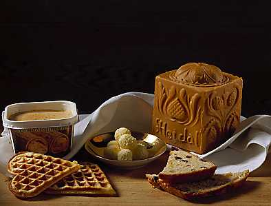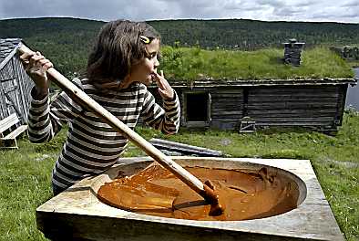 OPPSKRIFT Lagt inn den 24.09.2003 Sendt inn av Magnús ®&Mac173;ór Magnússson Brunost 5 liter melk sukker litt smør Brunost - a Norwegian treasure ![]() http://www.aftenposten.no/english/bildeserier/article458116.ece?start=10 ![]() One of the most common sights in Norway for generations - an open brunost - brown cheese - sandwich wrapped in wax paper. PHOTO: Rolf Aagaard ![]() A timeless view from Gålå, in Gudbrandsdalen. This area is the cradle of brown cheese, and the home of exported brunost. PHOTO: Knut Snare ![]() Randi Solbraa, her with grandchildren Anne and Ola, makes brown cheese for summer tourists in Gudbrandsdalen. PHOTO: Knut Snare ![]() Anne Solbraa (7) tastes brunost in progress. PHOTO: Knut Snare ![]() Olympic biathlon star Ole Einar Bjørndalen, here at the Winter Games in Salt Lake City, shows again that Norwegians can't leave home without it. PHOTO: Knut Snare ![]() Even Sugaren from the local Folldal Dairy, carries out taste tests on every brunost batch produced. PHOTO: Jon Hauge ![]() The world's largest brunost is unveiled at the UKA culture festival in Ås, in 1996. PHOTO: Tone Georgsen ![]() A sampling of brunost from dairy giant Tine. PHOTO: null ![]() Brunost can also be formal, here a fancy mold produces an elaborate cheese, destined for use on ... waffles. PHOTO: SCANPIX ![]() Anne K. Hindaker in a pose paying tribute to the original Synnøve Finden, who started her dairy with bicycle deliveries. PHOTO: Terje Bendiksby Brunost - Norwegian Brown Cheese http://www.bbc.co.uk/dna/h2g2/alabaster/A823024 "Have some of this, it's good." The Norwegian hands you an open faced sandwich with a slice of something redish brown, "it's 'Brunost', brown cheese." It doesn't look like cheese, you think, but it can't be as bad as some of the stuff you have heard they eat in this country so you take a bite. "No way is this cheese!" you exclaim. And you are perfectly correct. Cheesemaking all over the world consists of separating the curds from the whey, and making some sort of cheese from the curds. The whey is then flushed down the drain or used as cattle feed. More recently whey proteins have become popular as an ingredient in health food and dietary supplements for body-builders. But in some parts of the world it has been good food for centuries. In Italy it is used to make Ricotta, in Norway it is used to make Brunost. Real cheeses are made only from the curds. Ricotta, Brunost and similar, although often called cheeses where they are produced, are technically Whey based dairy products. History For more than 300 years Norwegian farmers have made cheeses from cow's milk and goat's milk and turned the leftover whey into different kinds of foodstuffs. Many strange concoctions existed and some of these are available regionally today. The simplest was to just boil out most of the water from the cow's whey, and shape the remainder into a sweet, low-fat, pale reddish brown 'cheese'. This is the most basic type of brown cheese and is simply called Mysost, 'whey cheese'. By mixing in cream, or using goat's milk, or a combination of goat's and cow's milk, and/or by leaving more water in the mix, all of todays brown cheeses came into existence1. Variations Brunost (lit. brown cheese) is the generic name for lots of different products, but ask the average Norwegian and she will tell you either that the particular type she prefers is the real Brunost, or that Brunost is a misnomer and that it's really Raudost (lit. red cheese). This entry will treat all the different types alike and not play favourites2. Brunost taste comes mainly from caramelised lactose and hence the product is sweet, with a hint of caramel, and tastes nothing like cheese at all. The use of goat's milk in some types adds another uncomparable taste that takes a little getting used to. Main types of brown cheese are: Prim With a water content above 30%3, making it spreadable, Prim is almost a Brunost cousin. The taste is pure Brunost however, and in some dialects Prim is the word for all Brunosts. Ekte Geitost Ekte Geitost is made with whey, milk and cream from goats. It has the most pronounced taste of all the Brunosts. The name translates to Real (or Genuine) Goat Cheese. There is a small export of Ekte Geitost. Fløtemysost Cream Whey Cheese is made from whey, milk and cream from cows. It has a milder taste than both Ekte Geitost and Gudbrandsdalsost. Gudbrandsdalsost Gudbrandsdalsost is named after the valley in Norway where it was first produced to sell outside the area. It uses whey, milk and cream from cows, and adds goat's milk. There is some production for export and it is sold as Gudbrandsdalen in other Scandinavia countries, Norgold in Germany, and Ski Queen in UK, North America and Australia. Production and use Is Brunost still popular today, you ask? The answer would be Yes. Annual production is aproximately twelve million kg, or almost four kg per Norwegian. 50% of this is Gudbrandsdalsost, 30% is Fløtemysost, and 8-10% is Ekte Geitost. The remainder is other varieties and small scale production for sale straight from the farm. The first step in the making of Brunost is removing the curds. The whey must not contain any remains of curds, rennet or lactic bacteria so today it is often pasteurized and centrifuged. Then milk and cream is added to the whey and it is boiled until it is a thick brown mass (in industrial production the initial dehydration is done with other methods than boiling). The brown colour appears at the end of the process when the mass reaches about 100 degrees Celsius. Several factors influence the colour, but a darker colour means a more pronounced taste, and a larger risk of it getting burned. The next step is to cool the mass quickly to about 80 degrees while stirring vigourously so the sugar forms small crystals with an even distribution. Even though no preservatives are added4 Brunost can be kept in the fridge for about four months, and up to a year at -8 degrees Celsius5. At lo